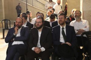 במעמד חנוכת הבית לביהמ”ד הגדול של חסידי צאנז ברמה ב’ העניק כ”ק אדמו”ר מצאנז תעודות הוקרה לראש העיר שמואל גרינברג ולמ”מ וסגן רה”ע שמעון גולדברג. צילום: יהושע פרוכטר
